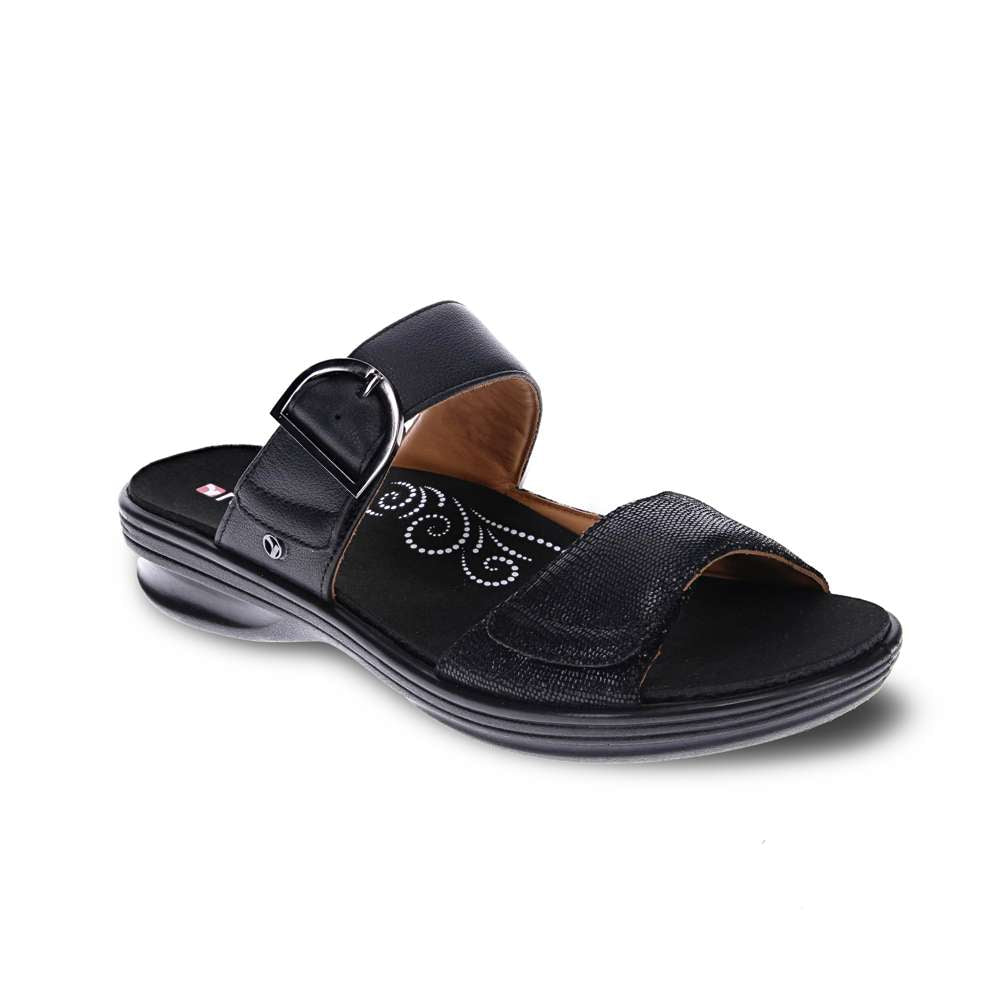 Cool and comfy, Calais is the simple slide with classic appeal. These women’s slides are adorned with an adjustable metal buckle detail, and a premium leather lining for a soft and durable touch. Our sleek and simple Calais slides are also orthotic friendly shoes, with a removable insole to fit your custom orthotics.