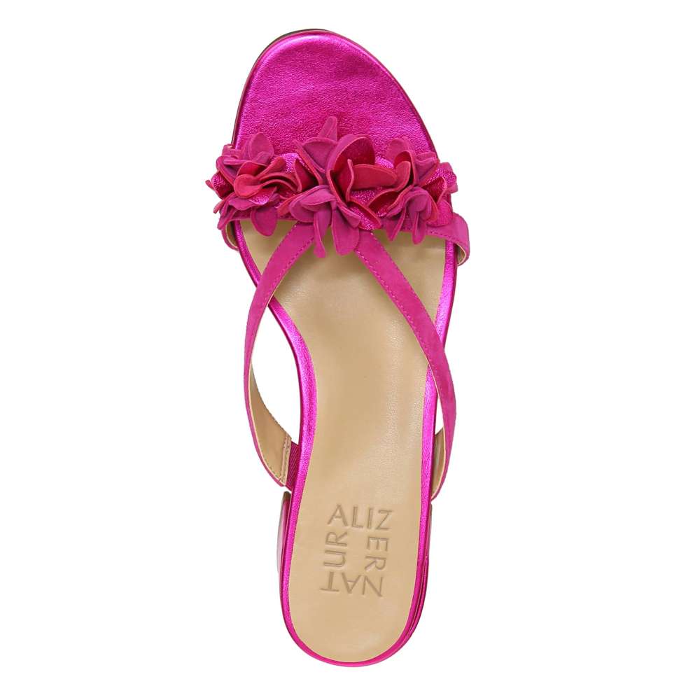 • Dressy slide sandal with floral details.