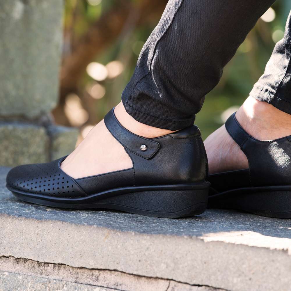 Delicate perforations adorn these stylish mary jane shoes, ensuring a soft, flexible fit. A tapered wedge adds just enough height, bridging the gap between work and weekend-wear. Like its namesake city, Osaka brings together modern styling while paying homage to a traditional silhouette. These orthopedic shoes for women feature a removable insoles which allows for the insertion of custom orthotics.